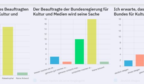 Nur 18% der Teilnehmer:innen erwarten, dass unter Weimers Leitung die Etats des Bundes für Kultur steigen werden. 45,5% erwarten dagegen, dass der Etat deutlich sinken werde – vor zwei Wochen erwarteten dies nur 22,5%. Die Personalie hat offenbar die Aussichten getrübt.