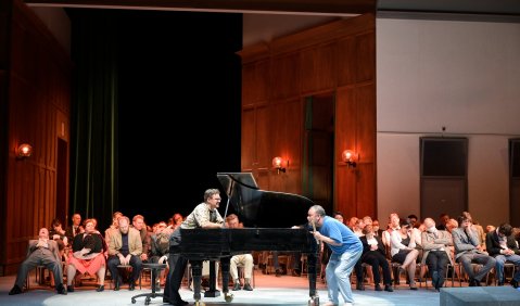 Das Regieteam (Jossi Wieler, Anna Viebrock, Sergio Morabito) verzichtet in der Neuproduktion der Deutschen Oper Berlin natürlich, wie zu erwarten war, auf Altnürnberger Stadtarchitektur, Trachten und Festwiese samt Folklore, es gibt keine Schusterstube (Sachs haust in einem der Übungszimmer des Konservatoriums von Dr. Pogner) – bei Wagner ist er übrigens Goldschmied. Auch kein Fliederbusch (der schließlich besungen wird) ist weit und breit zu sehen. Noch nicht einmal die obligate Prügelei (in der sich die Untiefe des „wohlanständigen“ Normalbürgers austobt) findet am Ende des zweiten Akts statt. Stattdessen ein unbeschreiblich nichtssagendes, szenisch unbeglaubigtes Tohuwabohu.