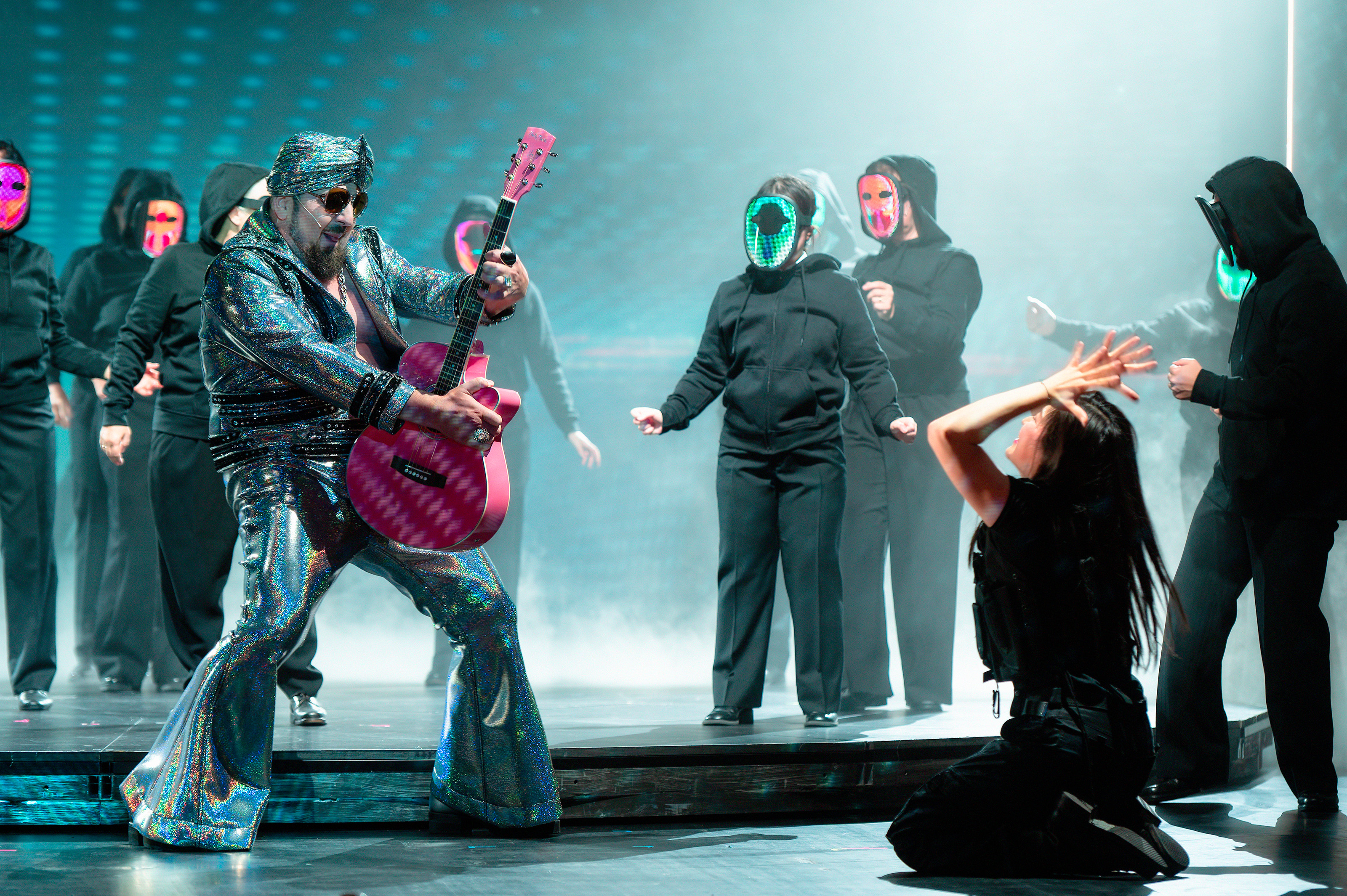 In unserer Zeit: die Flut aller Probleme. Inmitten all unserer Reizüberflutung haben sich der gerne inszenierende Intendant André Bücker und sein inzwischen auf Jahre in den Martini-Park ausgesiedeltes Staatstheater Augsburg getraut, diese Problematik auch in der technisch beschränkten Ersatzspielstätte zu gestalten. Also ein Spielsteg über das große Orchester bis nach vorne an die erste Sitzreihe; links und rechts große Bildschirme und mit Robi Voigt ein Video-Mann, der „in die Vollen“ gehen durfte, also Videozuspiel eines Moderators, der als „System“ vorgibt, wir könnten via eines QR-Codes Spielfassungen auswählen – natürlich Fake – und dann über beide Akte eine Flut aus bunter Designer-Grafik, verwaschenen Daten-Bildschirmen, im Text mal genannten Fotos und schließlich bedrohliche Echsen-Aliens … bunte Dauerbeflutung ohne bannende Wirkung.
