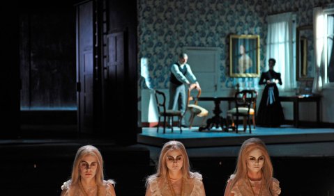 Jens Kilian hat zwei Holzhäuser auf die Hauptbühne bauen lassen, die – sich drehend – bei sorgfältig wechselndem Licht immer wieder neue Einblicke in die guten Stuben zulassen. Ausgestattet sind sie mit Seidentapeten, allemal dem selben Frauenportrait in Öl und feinem Nussbaummobiliar. Es ergeben sich Ausblicke auf das keineswegs immer harmonische Familienleben. Die Altistin Evelyn Krahe gibt die reiche Witwe Warwara energisch und Zvi Emanuel-Marial den herrschsüchtigen Pjotr (keine neue Oper ohne Counter oder Altus!). Portionsweise kommt die Illusion einer Gesellschaftsfamilienanamnese auf. Überwiegend wirken die Szenen surrealistisch. Von schlichter Narration ist die Inszenierung des Choreographen Schlömer jedenfalls weit entfernt: Das Nonverbale, Atmosphärische und der Sound verweisen auf Unheil. Eben „das Böse“, das auch im Namen der Nächstenliebe nicht aus der Welt weichen will.