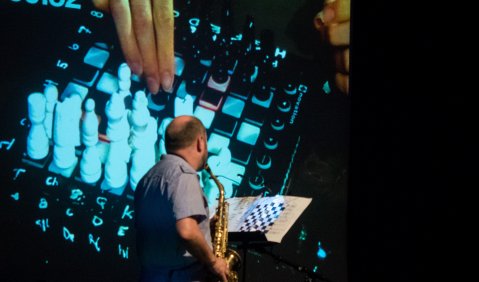 Nach der Pause Timo Kreusers Uraufführung von „Ein Regime“. Etwa 30 bis 40 Minuten. Die Musiker spielen in Richtung Leinwand hinter der Bühne, denn dorthin wird ein Schachfeld projiziert, auf dem Estelle Lefort und Meredith Nicoll als Mitglieder des Solistenensemble PHØNIX16 die Figuren bewegen. Das Schachbrett selbst ist ein umgebautes Launchpad und so haben die Figurenbewegungen auch immer (?) irgendwelche optischen Konsequenzen (auf den kleinen Videoleinwänden links und rechts der Bühne) zur Folge, was wiederum die Musiker zu anderen Klangaktionen veranlasst – auf deren Notenpulten liegen Schachbrettskizzen, die mit Einzeichnungen versehen sind. Durchschaubar war das für mich nicht.