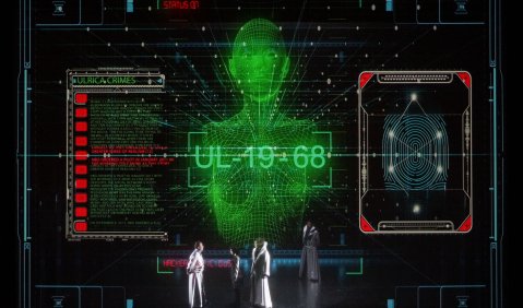 Das Kieler Publikum, so wie der Rezensent es bisher kennengelernt hat, bevorzugt eher einen konservativen Umgang mit einem Werk. Was ihm Pier Francesco Maestrini, der experimentell eingestellte italienische Opernregisseur, jetzt bot, zwang es wohl zu sehr zum Umdenken. Doch sollte man bedenken, dass seinerzeit Verdi mit dem sehr unzufrieden war, was die Zensur an Rücksichtnahmen bei seinem „Un ballo in maschera“ forderte, der als Reflex auf die Ermordung des schwedischen Königs Gustav III. in dessen Heimat spielen sollte. Dennoch stimmte Verdi schließlich zu, den König in einen unverdächtigeren Grafen zu wandeln, der als Gouverneur im weit entfernten Boston einzusetzen war. Auch wenn der Norden der amerikanischen Westküste Ende des 18. Jahrhunderts schon gut besiedelt, Boston selbst reich und mächtig war, muss den Römern 1859 zur Zeit der Uraufführung der Spielort fremd, eher unwirtlich, vielleicht exotisch vorgekommen sein. Will eine Inszenierung heute Verdis Schwierigkeiten nachempfinden lassen, bietet sich auf unserer Erdkugel kaum mehr ein ebenso gearteter Schauplatz. Maestrini suchte ihn wohl deshalb in der Zukunft, in einem Biosphärenreservat oder irgendwo auf einer interplanetaren Basis, wo er Graf Riccardo in einer Kommandozentrale residieren lässt. Das wirkte plausibel, ist das Handlungsgefüge doch auch so vorstellbar. Denn eines ist sicher, dass auch in Zukunft der Mensch sich nicht ändern wird, sich nicht vom heftigen Lieben und von heftigen Trieben lösen wird. Das hat uns Science-Fiction, längst salon- und kunstfähig geworden, schon vielfach bewiesen. Warum also der Buhschrei?