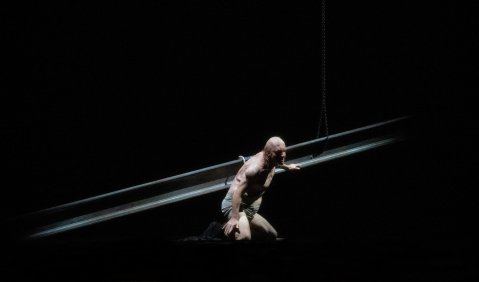 Die atemberaubendeste Szene des Abends geht freilich auf Castelluccis Kappe. In der dunklen Nibelheimwelt mit schwebendem T-Träger und einer Apparatur zur Reifproduktion, macht einströmender Nebel Alberich zwar tatsächlich unsichtbar, lässt ihn dann aber als Gefangener seiner selbst, an seinen eigenen Ring gekettet wieder auftauchen. Wenn Wotan mit Loges Hilfe Alberich in seiner Gewalt gebracht hat, zieht er ihm nicht einfach den Ring von der Hand (oder entreißt ihn ihm samt Finger). Der Götterganove und sein Helfer demütigen Alberich, indem sie den Splitterfasernackten an den in Nibelheim produzierten Reif gekettet drangsalieren und in der Höhe baumeln lassen. Scott Hendricks, der auch vokal mit der überzeugendsten Leistung des Abends glänzt, macht daraus ein darstellerisches Kabinettstück. Er beglaubigt das, was er Wotan entgegenschleudert: „Frevelte ich, so frevelt' ich frei an mir: doch an allem, was war, ist und wird, frevelst, Ewiger, du, entreißest du frech mir den Ring!“