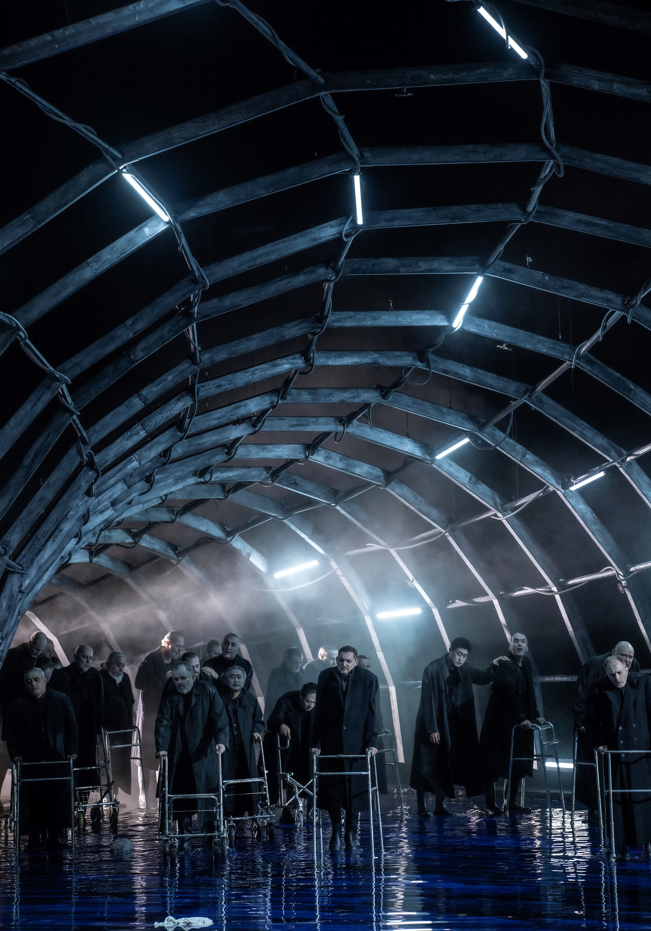 Bei Roland Schwab und seinem Bühnenbildner Piero Vinciguerra liegt der Gral hinter einem betörend schönen Wald. Den durchwandert Parsifal im Video von Ruth Stofer, das während des Vorspiels bühnenportalfüllend projiziert wird. Er landet an einem leicht gebogenen Tunnel, der offensichtlich unbeabsichtigt unter Wasser steht. Den von Parsifal erlegten Schwan bringen sie gleichwohl aus der Tiefe des Tunnels nach vorn. Ein realistisches Bauwerk ist das also nicht, sondern ein metaphorisch assoziativer Raum. Hier wankt denn auch eine ziemlich desolate Truppe von Alt-Rittern mit Gehilfe ans Licht. Beim der Gralsritual genügt ihnen der purer Anblick dieser Prozedur offenbar als Frischzellenkur.