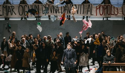 Im Grunde hat er nur gegen das Klischee aninszeniert, „Don Carlo“ sei ein Kostümschinken, in dem er diese Idee auf die Spitze treibt. Man hätte verstanden, wenn Philipp II. bei ihm einem Diktator von heute geglichen hätte. Oder es gegen die Straflager-Vorliebe der Herrschenden gegen die Untertanen gegangen wäre, die ihre Gedankenfreiheit einfordern. Stattdessen banalisiert er szenisch, was musikalisch hochdramatisch und packend erzählt wird. Ausbeutung in der globalisierten Textilindustrie, Umweltverschmutzung oder brennende Wälder als Symptom der Naturkatastrophen sind schlimm. Aber lassen sich die allseits bekannten Video-Bilder dazu, wirklich gegen die auf den Punkt gebrachte Barbarei eines Autodafe in Stellung bringen? Ist das nicht längst ein zeitlos gültiges Bild dafür, wozu Menschen und von ihnen geschaffene Institutionen fähig sind?