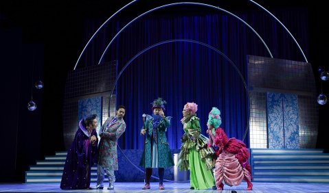Samuel Chan (Dandini) | César Cortés (Don Ramiro) | Junggeun Choi (Alidoro) | Clara Fréjacques (Tisbe) | Xiaofang Zhao (Clorinda). Foto: © Olaf Struck