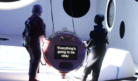 Es ist ein Blick von unserer Gegenwart aus in die womöglich nicht allzu ferne Zukunft: In „Singularity“ dramatisieren der tschechische Komponist Miroslav Srnka und der Autor Tom Holloway Probleme um computerisierte Menschen, Updates, menschliche und technische Fehlfunktionen. Ihre „Space Opera for Young Voices“ ist gezielt für den experimentierfreudigen Gesangsnachwuchs des Opernstudios der Bayerischen Staatsoper geschrieben. Nach den vier klassischen Stimmlagen sind vier Solisten als T(Tenor), S(Sopran), B(Bariton), M(Mezzosopran) benannt; ihnen allen ist schon ein Chip implantiert, mit dem sie wortlos untereinander kommunizieren können - mit einem zur Debatte stehenden Update sogar dann mit der ganzen Welt. Den schon neurotisch streitenden bis zerstrittenen Figuren sind noch vier, auf der Bühne komplett schwarz verhüllte, gleichsam digitale Avatare als „eT, eS, eB, eM“ singend beigeordnet, mal begleitend, mal kommentierend, mal… und da beginnt das Vielerlei: nach einer Art Vorspiel auf Erden - sprich: Vorderbühne mit einem Schwarzen Loch als Zwischenvorhang - werden alle in ein „Spa“ im Weltraum katapultiert. Das ist vom Ausstatter-Team um Raimund Bauer als löchriger Kubus gestaltet, dazu allerlei Weltraum-Projektionen und Farbwechsel.
