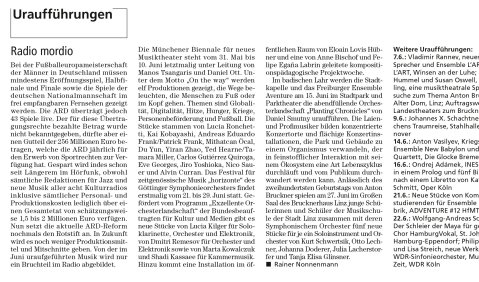 - 22.6.: Wolfgang-Andreas Schultz, Der Schleier der Maya für gemischten Chor HamburgVokal, St. Johannis, Hamburg-Eppendorf; Philipp Maintz und Lisa Streich, neue Werke für WDR-Sinfonieorchester, Musik der Zeit, WDR Köln
