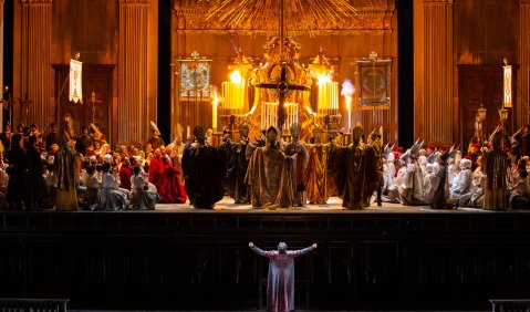 Regisseur Davide Livermore hat diese „Tosca“ – nach seinem Mailänder Vorjahreserfolg mit Giuseppe Verdis „Attila“ – als bombastisches Theaterprojekt umgesetzt. Da tanzt im Bühnenbild des Designerstudios Giò Forma die berühmte Kirche Sant’Andrea delle Valle gleichsam mit Kapellen, Säulen, Bögen und Bildern eine Choreografie, die über das statuarisch geführte Personal hinwegtäuschen soll. Bewegend hingegen gelingt ihm der zweite Akt, in dem der Polizeichef Scarpia den Maler foltern lässt und dessen Geliebte erobern will. Ein ergreifendes Drama aus Rom mitten in Mailand. Ausgestattet als prunkvolles Kostümfest von Gianluca Falaschi.