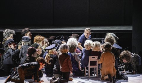Massen von Kinderstatisten mit Erwachsenen-Wasserköpfen, die zu eindrucksvollen Fratzen mutiert sind, scharen sich um den Mörder, den der texanische Bariton Scott Hendricks verkörpert, der einzige Mensch von normaler Statur in Barrie Koskys Inszenierung auf Klaus Grünbergs schlichter Bühne. Kinder spielen geschrumpfte, verhärmte Erwachsene. Das hat Kosky – zugegeben – eindrucksvoll in Szene gesetzt. Wahnsinn im Kleinformat? Ihre Stimmen – singend und sprechend – erklingen aus dem Orchestergraben. Eine große Herausforderung für den (erweiterten) Kinderchor der Komischen Oper Berlin (Dagmar Fiebach). Moritz Eggert schrieb für das Werk den in der Musiktheaterliteratur wohl größten Kinderchor-Part überhaupt. Die musikalische Leitung liegt in den Händen von Generalmusikdirektor Ainars Rubikis, der dem Affen Zucker gibt bei der Uraufführung dieser fragwürdigen Auftragskomposition. Ein gewaltiger Aufwand. Nur: musste er sein? Was bringt es, den grandiosen Film zu veropern? Er ist nicht zu toppen, schon gar nicht mit dieser Oper.