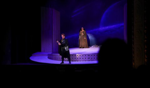 Ich sah eine kreisrunde Fläche, eine Art Wieland Wagnerscher Weltenscheibe, auf der Tristan und Isolde auf Kissen lagerten, ein Heer von Lemuren, schwarz gekleideter, befranster Totengeister, oder was es sein sollten, tänzelten um das Liebespaar herum und löschte schließlich acht Fackeln, wenn ich mich verzählt habe. Bei Wagner ist von einer die Rede. Im Hintergrund Weltallimpressionen in Blautönen. Isolde (Eliška Weissová) war aufgrund ihrer enormen Körperfülle kaum in der Lage aufzustehen, Tristan (recht ordentlich singend Jakub Pustina) war ein eher spacker Bursche, der ihr Sohn hätte sein können. Diese monumentale Isolde sang nicht, sie brüllte mit Riesenstimme, in violett gewandet, sodass die ganze Liebesszene nicht einen Moment von Innigkeit hatte. Brangäne (Karla Bytnarová) in Gestalt einer Magd, mit einer Frisur wie Witwe Bolte, hatte immerhin eine schöne, gut geführte Stimme. Kurwenal sang leidlich anständig (Richard Haan). König Marke (Serguei Nikitine) hingegen war in Kostümierung und verbrauchter Stimme keine Autoritätsfigur, eher ein lächerlicher Theaterkönig wie aus einem Kindermärchen. Von den übrigen Stimmen muss nicht die Rede sein.