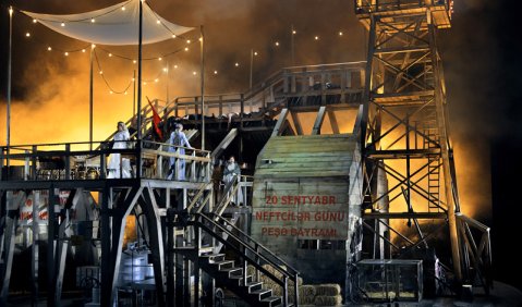 Immer wieder überlagern sich die historischen Film-Projektionen einer anderen Handlung mit jenen des Musikdramas, schaffen im Betrachter eine zusätzliche Nervenanspannung, wenn nicht Überforderung. Der historische Film wird unterschnitten mit Nahaufnahmen von Siegmund und Hunding, den Georg Zeppenfeld mit voluminösem Bass verkörpert. Castorf-Assistent Patric Seibert spielt einen flüchtigen Revolutionär, der sich im Käfig der in der Handlung des 3. Aufzuges offenbar bereits geschlachteten Truthähne versteckt; sein historisches Double im Film wird später mittels Eisenschere aus dem zum Gefängnis gewordenen Unterschlupf befreit. Dass die Handlung dann im Baku des Jahres 1942 angekommen ist, dies können – trotz kyrillischer Buchstaben und aserbaidschanischer Sprache – alle Zuschauer entziffern, zumal es wiederholt im Film eingeblendet wird. 1.200 Tonnen Öl, mittels einer Zündschnur zur Explosion gebracht, konterkarieren den starken Abschied zwischen Vater und Tochter.