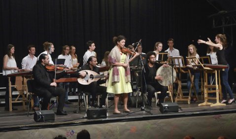 Am darauffolgenden Samstag trafen sich junge Musikerinnen und Musiker in verschiedenen Workshops: Bei dem Komponisten und Gitarristen Marc Sinan entwickelten sie gemeinsam eine Komposition. Eine Gruppe Hackbrett-Spieler ließ sich vom Jisr-Ensemble in die arabische Musik einführen. Andere lernten bei der tschechischen Sängerin und Violinistin Iva Bittová zu improvisieren. Und Rhythmusbegeisterte – darunter junge Flüchtlinge – machten TaKeTiNa mit Sabine Bundschu. Am Nachmittag fand dann das Jisr-Ensemble mit dem Hackbrett-Jugendorchester Bayern und Iva-Bittová im Projektorchester AUFTAKT! zusammen. Sie probten das arabische Stück „Lamone“, zu dem Iva Bittová improvisierte und das sie dann am späten Abend, zum Abschluss der Konzerte, dem begeisterten Publikum präsentierten. Sie beendeten damit einen spannungsreichen Abend, der von der Improvisationskunst von Marc Sinan und Iva Bittová bis zum präzisen und gekonnten Spiel des Bayerischen Jugend-Barockorchesters reichte, von den gefühlvollen arabischen Klängen des Jisr-Ensembles bis hin zum fröhlichen und lebhaften Auftritt des Hackbrett-Jugendorchesters Bayern. In der Pause zeigten die Musikerinnen und Musiker auf Instrumenten-Inseln den Besuchern ihre besonderen Musikinstrumente. Die Einladung des Jisr-Ensembles zum Workshop und den Auftritten ist ein Beitrag der Jeunesses Musicales Bayern zu dem Projekt „Musik schafft Heimat“ im Rahmen der Initiative „Integration und Toleranz“ des Wertebündnis Bayern. Hierbei wird die Integration geflüchteter Menschen durch Musik angestrebt. Das Thema „Heimat“ griffen auch Schülerinnen und Schüler der Münchner Adalbert-Stifter-Realschule in einem Film auf, den sie in den Wochen vor dem AUFTAKT!-Festival drehten und beim Festival präsentierten.