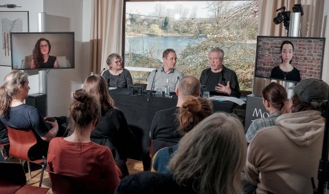 Monheim Triennale Pressegespräch mit Edith Langgartner, Daniel Zimmermann, Reiner Michalke und auf den Monitoren links Julia Úlehla und rechts Yuniya Edi Kwon. Foto: Niclas Weber für Monheim Triennale