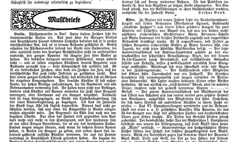 Gewiß erhalten die Philharmoniker seitens der Stadt eine Subvention, die aber natürlich unter den heutigen Verhältnissen nicht im entferntesten ausreicht, den ganzen Apparat für längere Zeit über Wasser zu halten. Sie bedürfen dringend weiterer Hilfsmittel, wenn anders nicht – und es sollen einzelnen Künstlern bereits Angebote vom Auslande gemacht sein – diese Körperschaft sich auflösen soll. Es ist ein bedenkliches Zeichen, aber doch ein Zeichen der Zeit, dass die wirtschaftliche Not auch solche Institute zu gefährden droht. Was hier einem ganzen Orchester bevorsteht, das wiederholt sich im Kleinen bei einzelnen Konzertgebern. Der deutsche Künstler ist fast außerstande, die hohen Beträge aufzubringen, die für Saalmiete und alle Nebenausgaben notwendig sind. So haben denn nicht nur Anfänger, sondern auch Künstler mit Namen entweder die Zahl ihrer Konzerte verringert, oder überhaupt auf ein Konzert verzichtet. Teilweise sind sie dazu übergegangen, an Stelle der Orchesterbegleitung sich mit einer Klavierbegleitung zu begnügen. […] Daraus darf nicht geschlossen werden, dass nun etwa die Konzertflut in Berlin einigermaßen abgeebbt wäre. Im Gegenteil: die Säle sind nach wie vor begehrte Objekte. Nur eben das Inland tritt gegenüber dem Ausland mehr und mehr in den Hintergrund, und hier wiederum sind es vor allen Dingen Amerikaner, die es um des berühmten Dollarstandes wegen wagen können, auch wenn sie daheim keinen Namen haben, in Berlin ein Konzert zu geben, und neben ihnen sind besonders zahlreich russische Künstler vertreten, die aus der Heimat verdrängt in Deutschland Obdach gefunden haben. […]