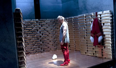 Peter Sykora steckt die ganze Bagage in historistische, wunderbar überzeichnete Kleider. Oppenheimer trägt einen eleganten roten Zwirn. Allerdings nur, wenn er sich gerade im Rückblick auf sein Leben befindet, dies ist nämlich die dramaturgische Volte des Ganzen. Den Ausgangs-, Kern- und Endpunkt bildet ein Kerker. Hier sitzt und sinnt Süß in Lumpen, sein Henker schaut schon zum Fenster herein. Immer wieder verschwindet die Zelle für mehr oder minder kurze Zeit, die Drehbühne kommt zum Einsatz und zeigt des Herzogs Wunderkammer mit Schmuck und Trophäen hinter Glas, ein Schlafzimmer oder enge Gänge. Dunkle Spiegel sorgen für bedrückende Atmosphäre.